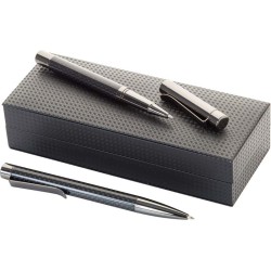 Sada per - elegantní kovové kuličkové pero a roller s lesklým chromovaným zdobením značky André Philippe. V dárkové krabičce z PU kůže a s modrou náplní.