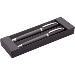 Elegantní sada kovového pera s kuličkovým perem a rollerem v černé papírové dárkové krabičce. S modrou náplní.