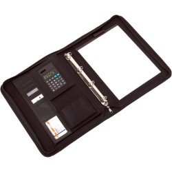 Složka A5 vyrobená z vysoce kvalitní lepené kůže, se zipem, různými kapsami, perem, držákem a stojanem pro smartphone, kroužkovými pořadači a zápisníkem s linkami a také s malým kalendářem. Vaše logo vyryjeme na vnější plech.