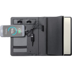 DIN A5 portfolio obsahující zabudovanou 4000mAh power banku, různé kapsičky, poutko na pero a držák na telefon a USB kabel. Gumový magnetický závěr v sobě má LED pro zvýraznění natištěného loga.