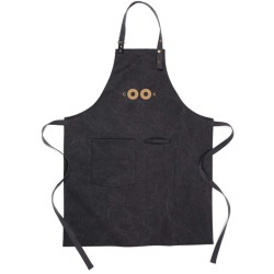 Povoskovaná zástěra s koženými detaily, nastavitelný popruh, dvě kapsy na hrudníku a jedna velká spodní kapsa.