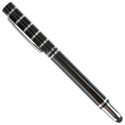 Kovová propiska CAGERI SOFT s hnědo-černými doplňky, s pogumovaným povrchem. Velkoobsahová modrá náplň.