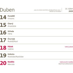 Spirálově vázaný stolní kalendář na zakázku s barevnou grafikou na stojanu na poznámkové bločky. Obsahuje 50 samolepících papírků z recyklovaného papíru (100×75 mm) a 100 plastových fóliových popisovačů stránek. S 12 měsíčními listy a titulní stranou. Cena zahrnuje digitální tisk na všech stránkách, nezahrnuje tiskovou přípravu. Min. mn.: 100 ks.