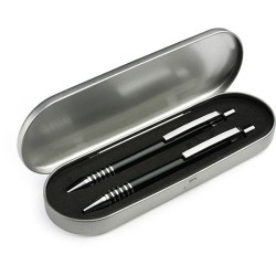 Sada per z recyklovaného hliníku s kuličkovým perem a rollerem s pogumovaným povrchem a detaily růžového zlata. S modrou náplní. Se speciálním povrchem pro zrcadlové laserové gravírování v růžovo-zlaté barvě. V černé papírové dárkové krabičce.