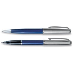 Elegantní sada kuličkového pera s otočným mechanismem a rolleru s krytkou v decentním designu. Hliníkové tělo se stříbrnými doplňky. Dodáváno v samostatné kartonové krabičce s černým víkem. Pero s jumbo náplní. Modrá barva inkoustu.
