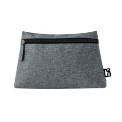 Kosmetická taštička z polyesteru 600D RPET s horním zapínáním na zip a hnědým PU detailem.