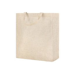 Nákupní taška s klínkem a dlouhými uchy ze 70 % recyklované bavlny a 30 % RPET polyesteru, 140 g/m². S výraznou etiketou o recyklované bavlně.
