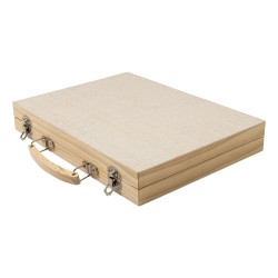 Sada 24 kusů v dřevěném pouzdře na barvy s uzávěrem a kovovými panty. Obsah: - 1 tužka - 1 guma - 1 ořezávátko - 8 pastelek různých barev - 1 štětec - 12 vodových barev různých barev.