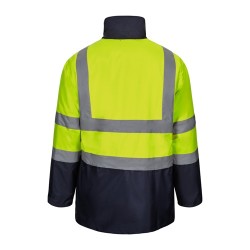 "Dvoubarevná parka (190 g/m²), z polyesteru (100%), s PU zátěrem. Otvor na vnitřní straně zad se zipem pro snadné přizpůsobení. Centrální zip, skrytý légou, která se zapíná na háček - poutko na trupu a rukávech Skrytá kapuce v límci a žebrované manžety. Obsahuje tři kapsy (2 spodní kapsy a 1 vnitřní kapsa). Výrobek v souladu s nařízením EU 2016/425, certifikovaný podle EN20471 a třídy č. 2. Velikost: S, M, L, XL, 2XL, 3XL