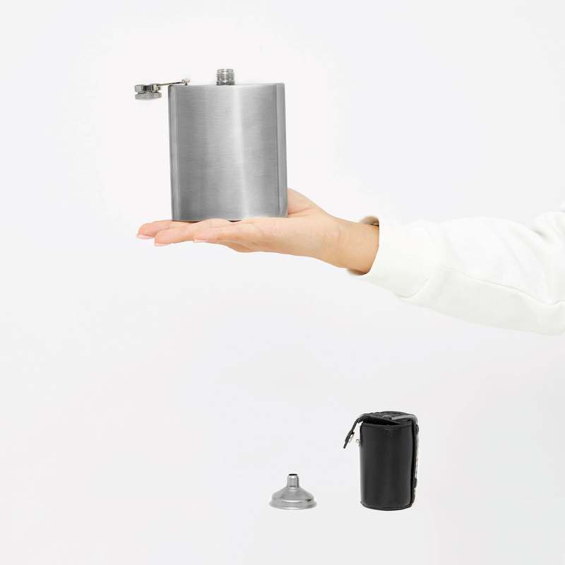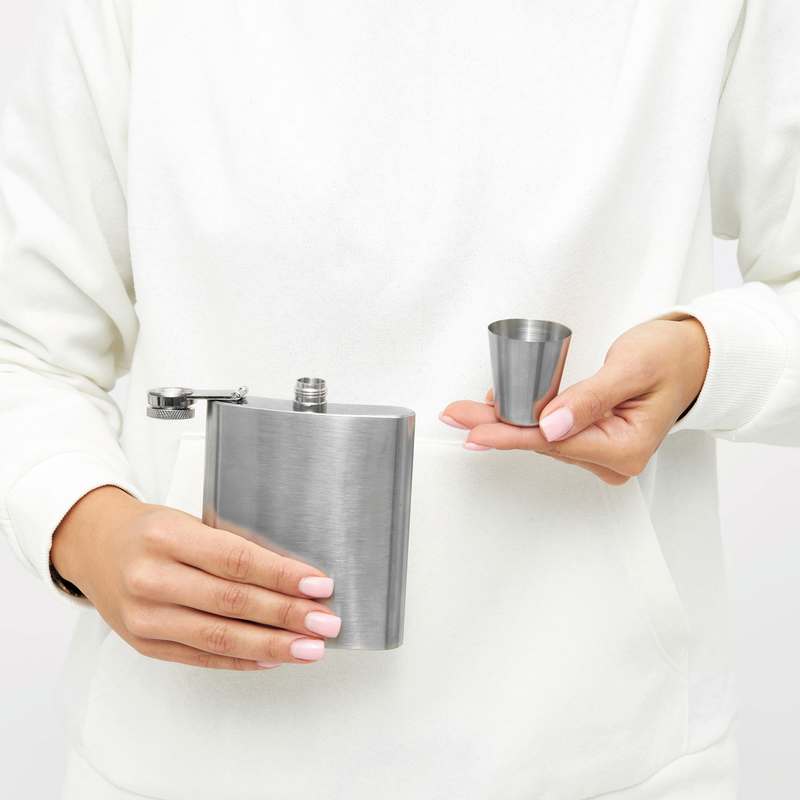 7 dílná nerezová sada GENTLEM s kapesní nerezovou láhví (objem cca 210 ml), trychtýřem a 4 malými kalíšky v ochranném pouzdře