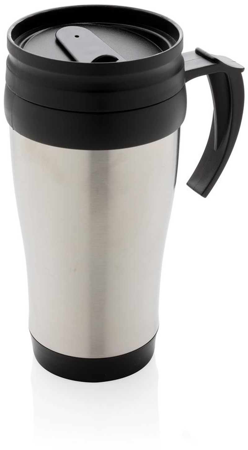 Hrnek o objemu 350 ml, vnější plášť z nerez oceli, vnitřek z PP, s černým víčkem a dnem.