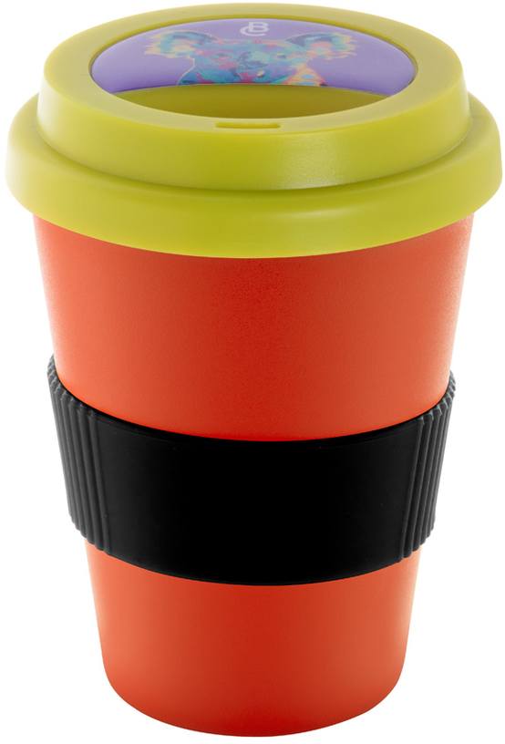 Dvoustěnný plastový termo hrnek na zakázku s víčkem na pití a silikonovým úchopem, 300 ml. Min. mn.: 50 ks.