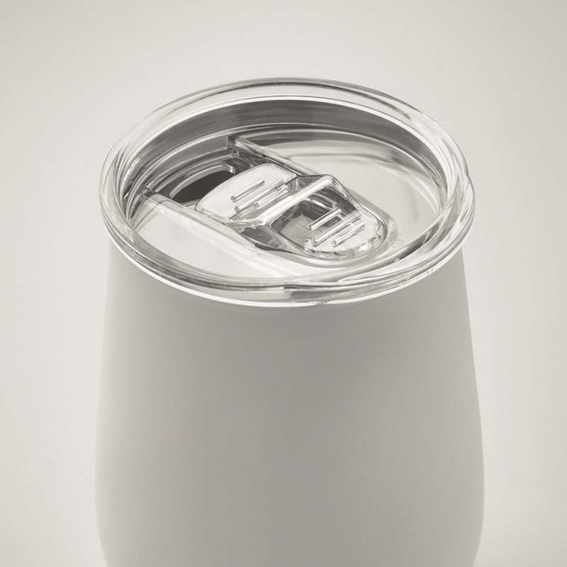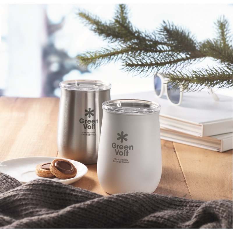 Hrnek z recyklované nerezové oceli (90 % recyklované nerezové oceli a 10 % nerezové oceli) s práškovým nástřikem. Víčko s posuvným zavíráním. Objem: 500 ml.