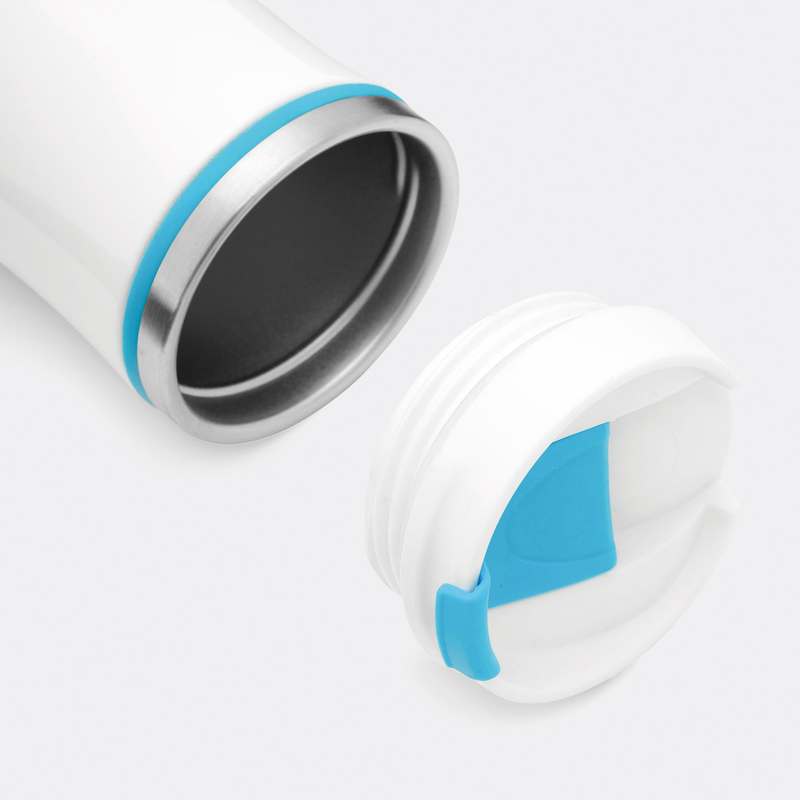 Dvoustěnný cestovní termohrnek CREMA: celonerezový, plastové šroubovací víčko, barevné detaily na hrdle a víčku, objem cca 400 ml