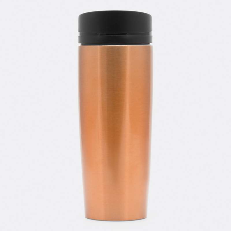 Dvoustěný cestovní hrnek EARLY MORNING: obě stěny z nerezové oceli, plastové víko s bezpečným šroubovacím uzávěrem, tlačítko OPEN / CLOSE a integrovaný nápojový otvor, gumové dno, objem cca 380 ml, s poutkem