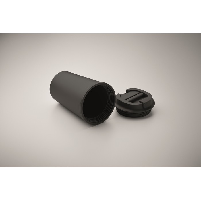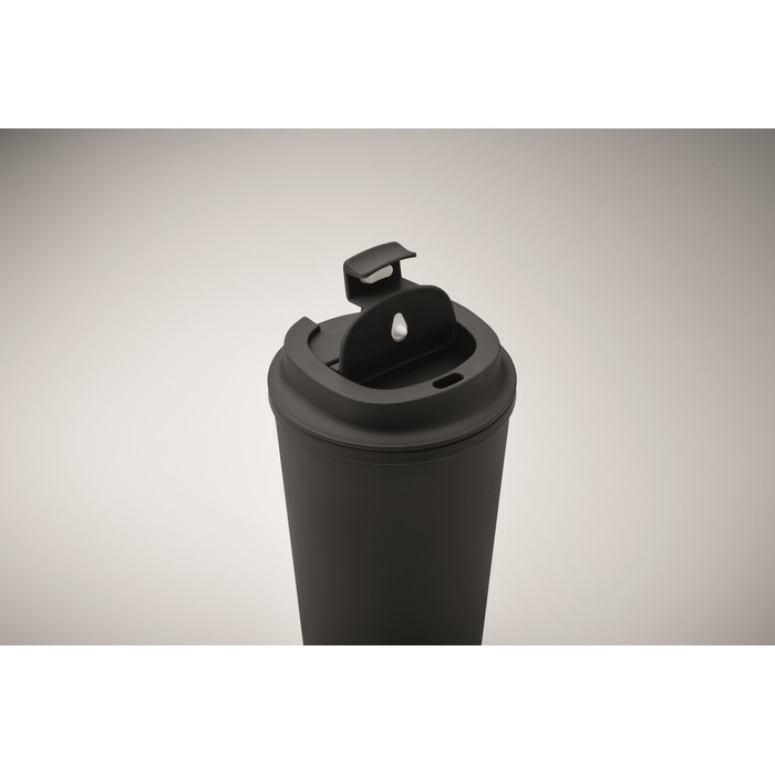 Dvoustěnný kelímek ze 100% PLA s víčkem z PP. Vnitřek z TPR. Objem: 350 ml.