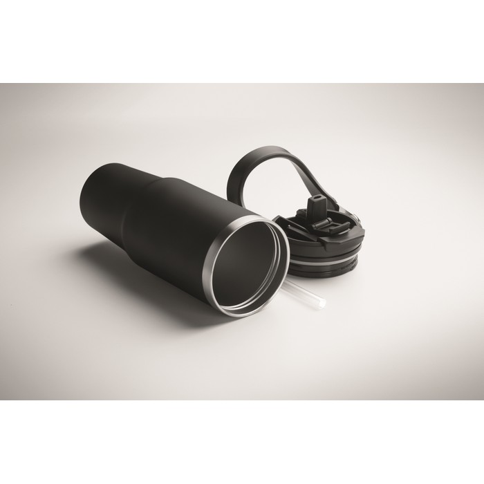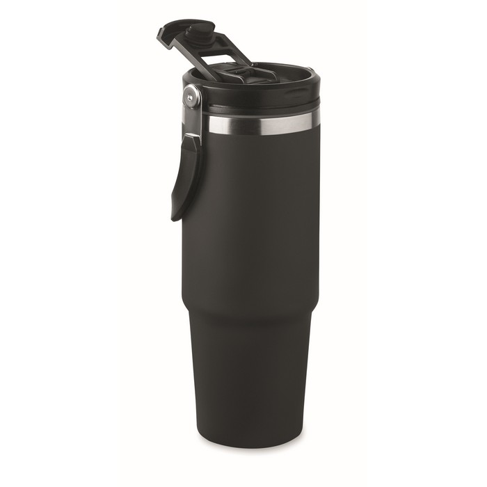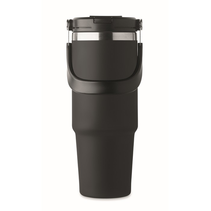 Dvoustěnný hrnek z recyklované nerezové oceli (90 % recyklované nerezové oceli a 10 % nerezové oceli) s víčkem s vnitřním brčkem a otvorem pro přímé pití. Rukojeť pro přenášení. Objem 850 ml.