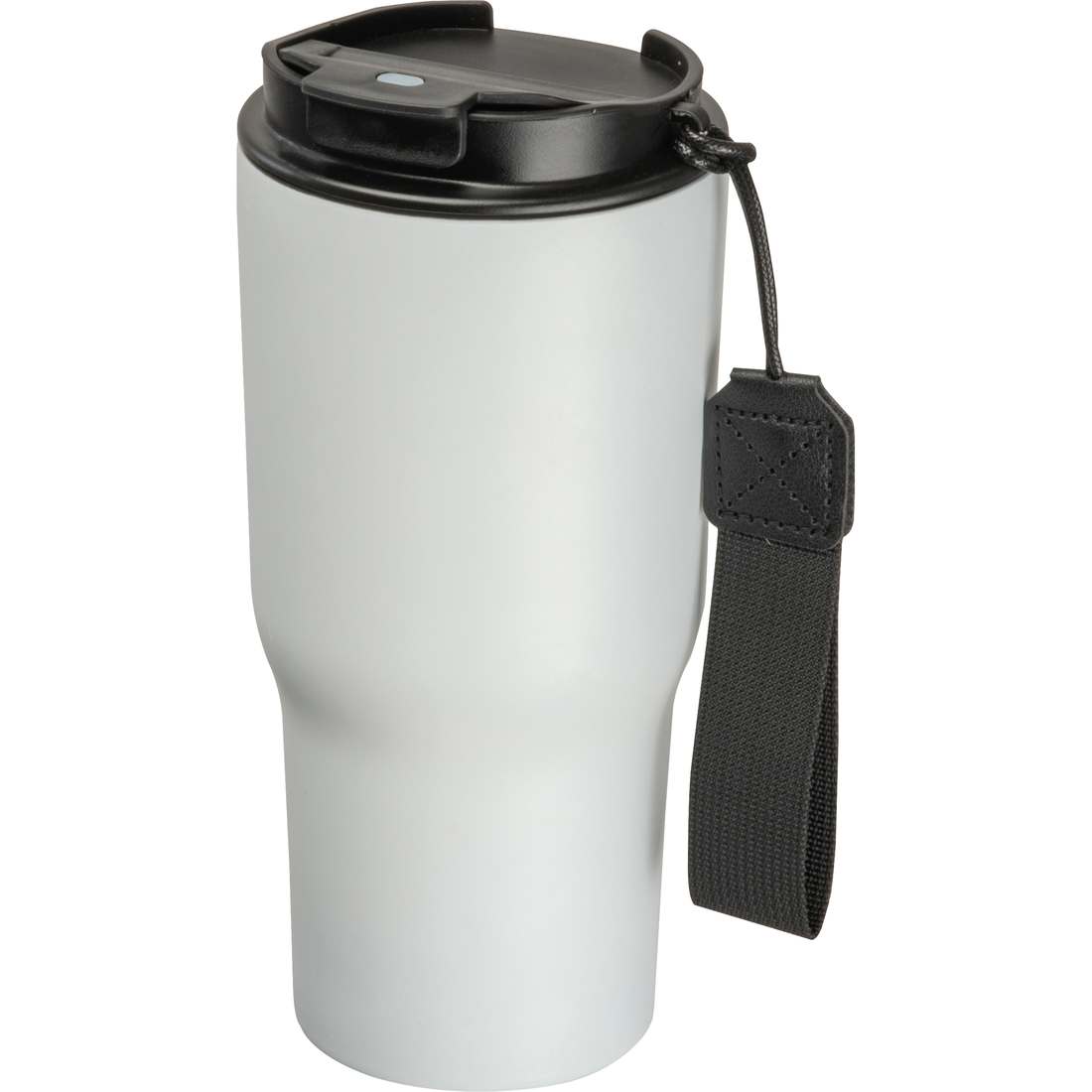 Elegantní dvoustěnný vakuový kelímek na pití z nerezové oceli o objemu 550 ml, nepropustným šroubovacím uzávěrem a otvorem na pití a praktickým popruhem na přenášení. Vaše logo vyryjeme na hrnek.
