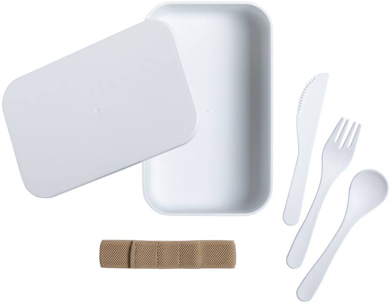 Box na jídlo z PLA plastu se sadou příborů (vidlička, lžíce a nůž) a elastickým páskem, 1000 ml. Bez BPA, 100% kompostovatelný PLA.