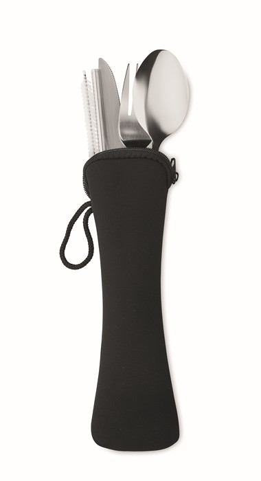 Znovupoužitelné nerezové příbory. Set obsahuje nůž, vidličku, lžíci, brčko a kartáček. V neoprenovém pouzdru.