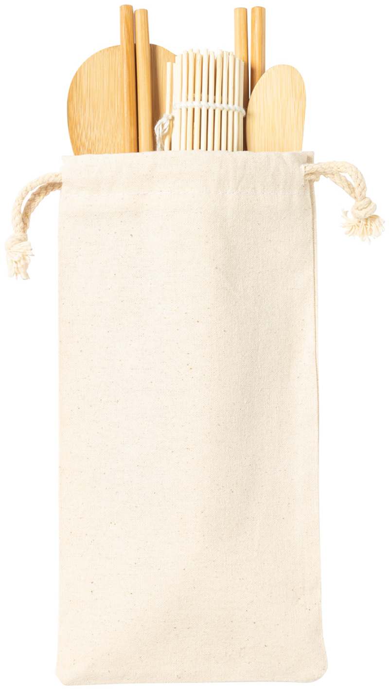 Bambusová sada na přípravu sushi s bambusovou podložkou na sushi, rýžovým pádlem, rýžovým nástavcem a 2 páry hůlek. V bavlněném sáčku.