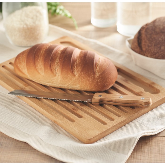 Bambusové prkénko na chleba. Sada obsahuje prkénko a nůž z nerezové oceli s bambusovou rukojetí.