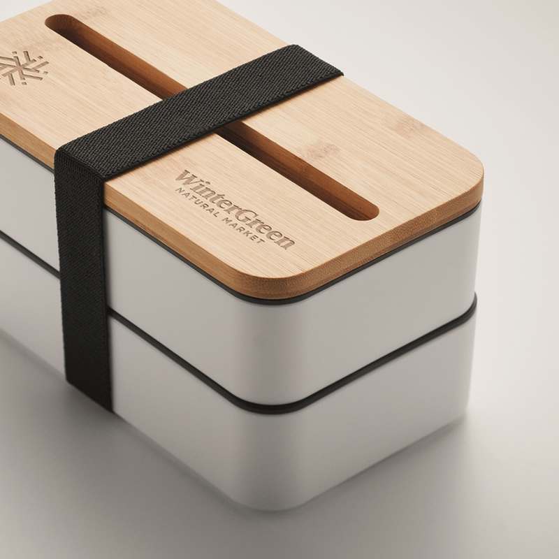 Dvoupatrový box na svačinu z recyklovaného PP s odnímatelnou přepážkou a 3 příbory. Zavírání pomocí pásky. Bambusové víko slouží i jako stojánek na telefon. Objem: 400 ml (2x). Bambus je přírodní materiál, může dojít k mírným změnám barvy, dekorace a velikosti. Neteče.