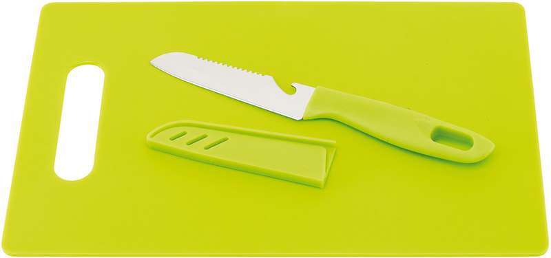 Krájecí deska SUNNY: obsahuje nůž s nerezovým ostřím a zabudovaným otvírákem na láhve, dírka pro zavěšení v rukojeti, speciální ochranné pouzdro, prkénko s dírou pro zavěšení