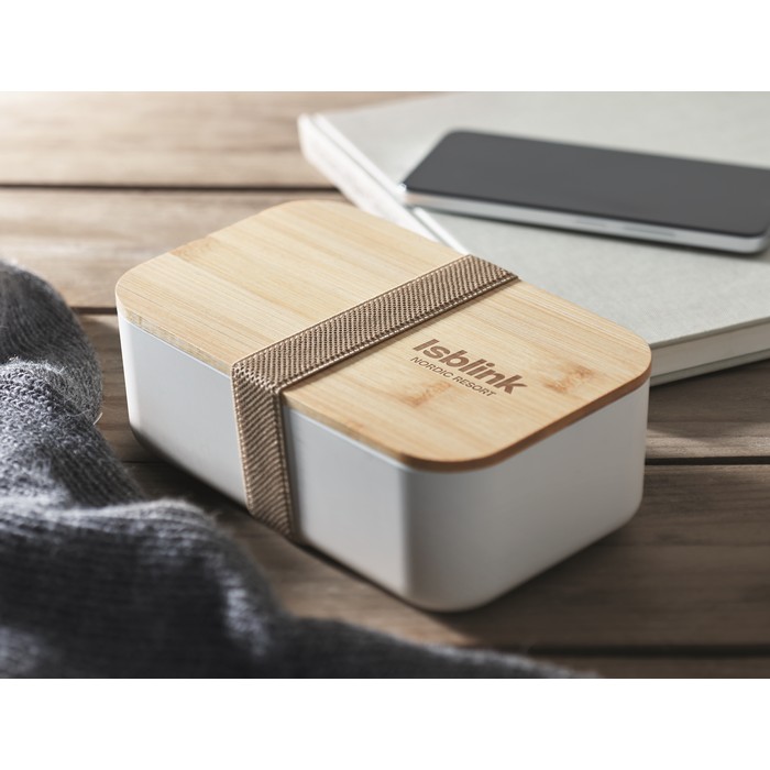 Obědová krabička ze 100% PLA kukuřice s bambusovým víčkem a elastickým uzávěrem z RPET. Objem: 1000 ml.