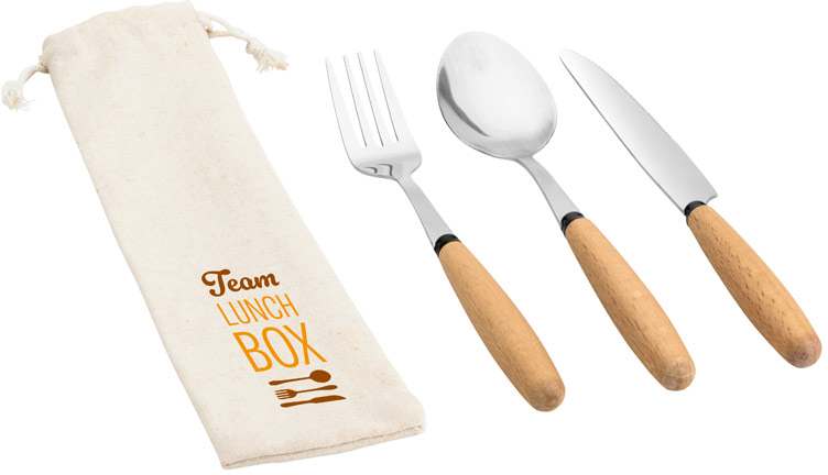Sada příborů sestávající ze 3 kusů: lžíce, vidlička a nůž z nerezové oceli s dřevěnými rukojeťmi. Dodáváno v bavlněném sáčku