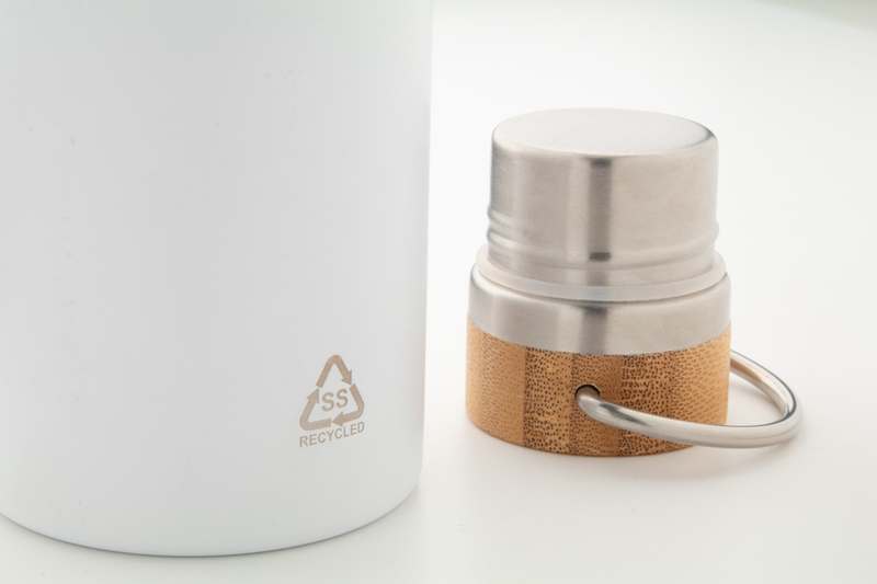 Dvoustěnná termoska z recyklované nerezové oceli s víčkem na přenášení z bambusu, 500 ml.
