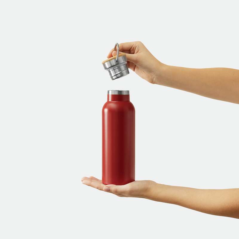 Izolovaná láhev na pití ECO FLAVOR, dvoustěnná: uvnitř a vně z nerezové oceli, bezpečné šroubovací víčko z bambusu se silikonovým těsněním a poutkem na přenášení, kapacita cca. 500 ml, udrží teplo až 8 hodin a studené až 12 hodin