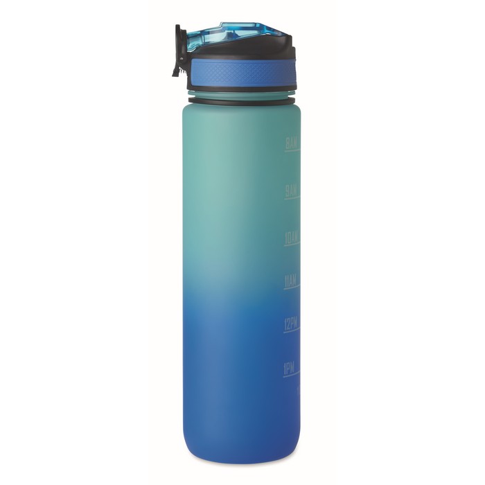 Sportovní RPET láhev na vodu s integrovaným brčkem, měkkým silikonovým náustkem, motivačním časovým značením, víčkem otevíratelným jednou rukou, bezpečnostním zámkem a popruhem na přenášení. Objem 1 l.