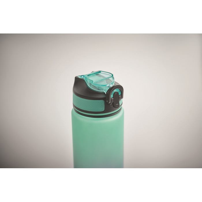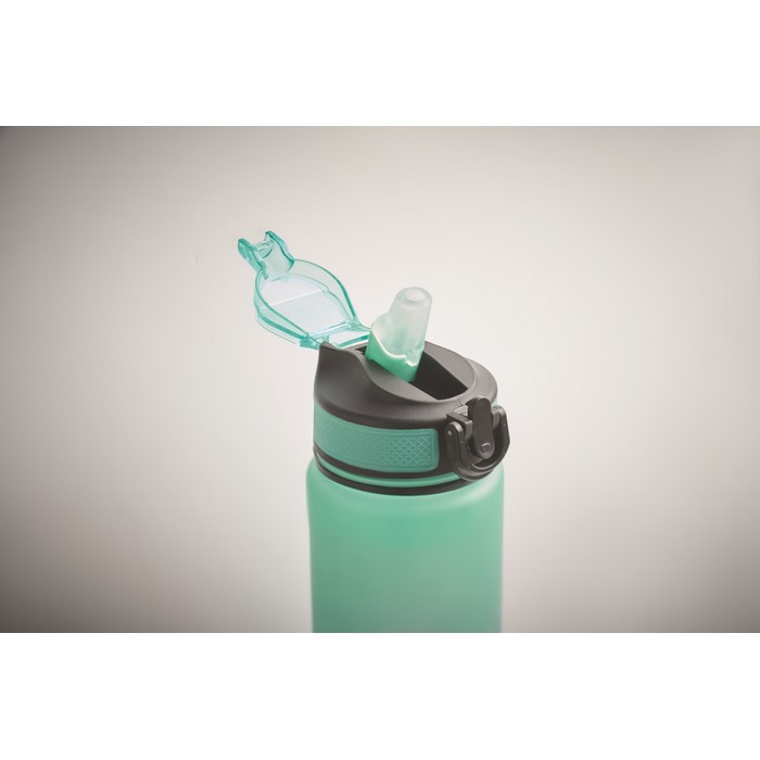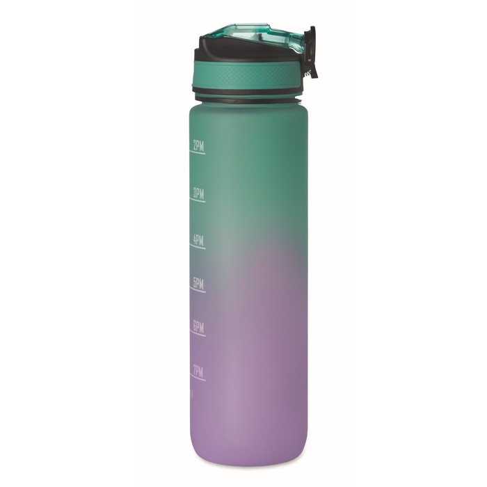 Sportovní RPET láhev na vodu s integrovaným brčkem, měkkým silikonovým náustkem, motivačním časovým značením, víčkem otevíratelným jednou rukou, bezpečnostním zámkem a popruhem na přenášení. Objem 1 l.