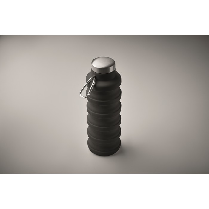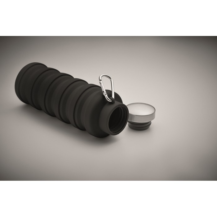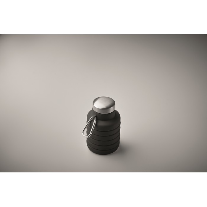 Skládací silikonová láhev s víčkem z nerezové oceli a hliníkovou karabinou. Karabina není určena pro horolezectví (neprofesionální použití). Objem: 500 ml.