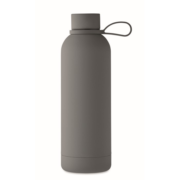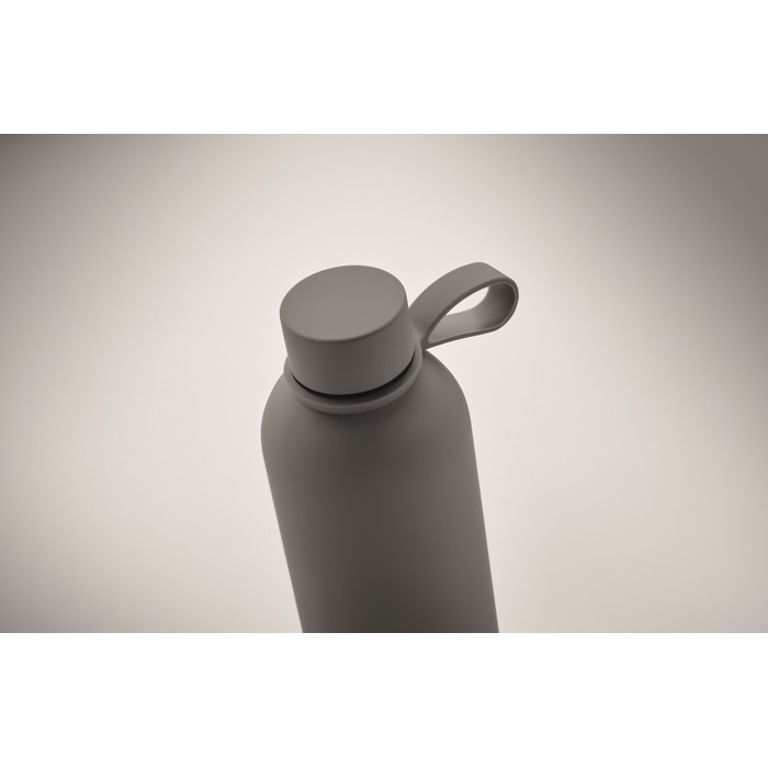 Dvoustěnná izolační láhev z recyklované nerezové oceli (90 % recyklované nerezové oceli a 10 % nerezové oceli) s gumovou povrchovou úpravou a silikonovým poutkem. Objem: 500 ml.