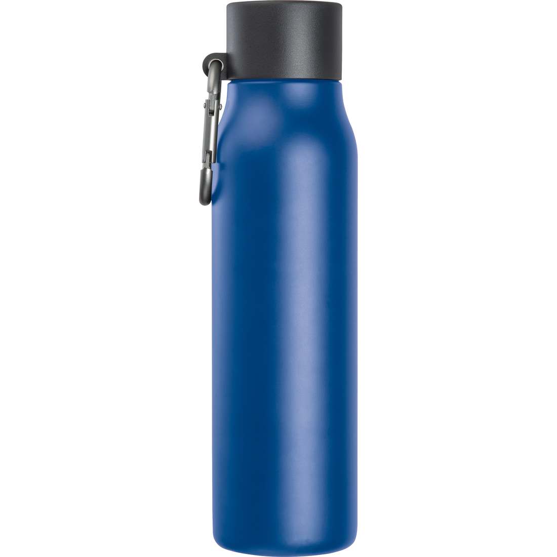 Dvouplášťová vakuová láhev na pití z nerezové oceli o objemu 600 ml, nepropustným šroubovacím uzávěrem a karabinou. Vaše logo vyryjeme na láhev.