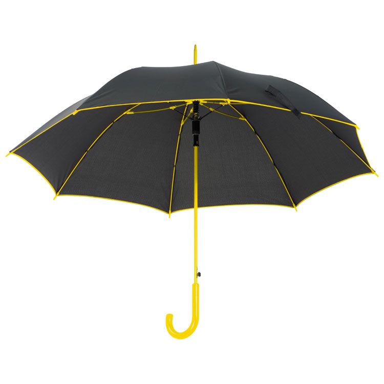 Dejte Vaší reklamě speciální vzhled s tímto holovým deštníkem. Deštník je vyroben z hedvábné látky (ponžé) s plastovým barevným lakovaným úchopem barevně sladěným s olemováním deštníku. Vaši reklamu natiksneme na jeden segment deštníku.