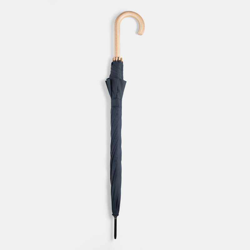 Automatický dřevěný deštník LIPSI: kovová žebra, dřevěné hroty a dřevěná zakřivená rukojeť, polyesterový povrch vyroben z recyklovaných plastů, zapínání na suchý zip