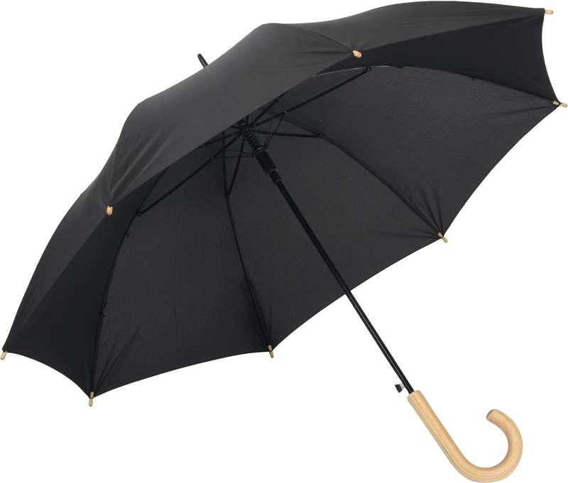 Automatický dřevěný deštník LIPSI: kovová žebra, dřevěné hroty a dřevěná zakřivená rukojeť, polyesterový povrch vyroben z recyklovaných plastů, zapínání na suchý zip