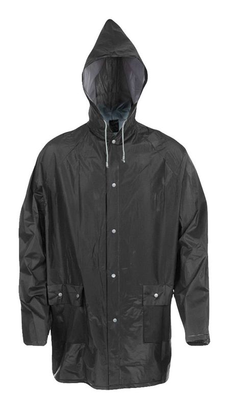 Pláštěnka s kapucí z odolného PVC s žáruvzdornou povrchovou úpravou. Se zapínáním na knoflíky a dvěma předními kapsami.