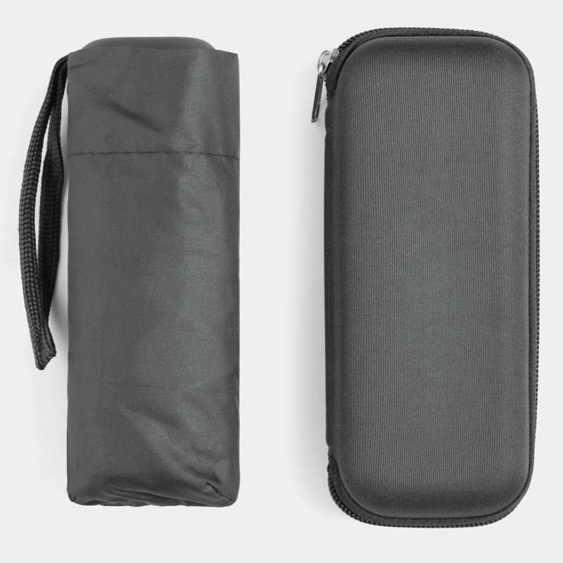 Hliníkový mini skládací deštník POCKET s EVA pouzdrem na zip: odlehčená konstrukce - pouze 164g, 5dílná hliníková konstrukce v kombinaci s prvky ze skelných vláken, kovové koncovky, barevně ladící pogumovaná rukojeť, voděodpudivý potah Pongee (ze směsi Polyesteru a Lycry)