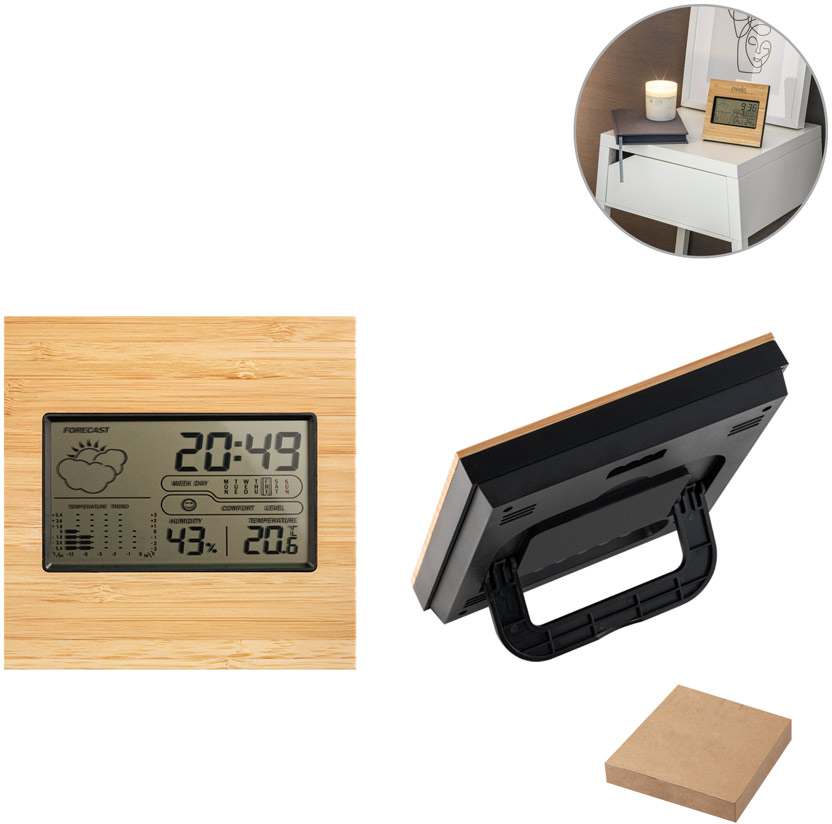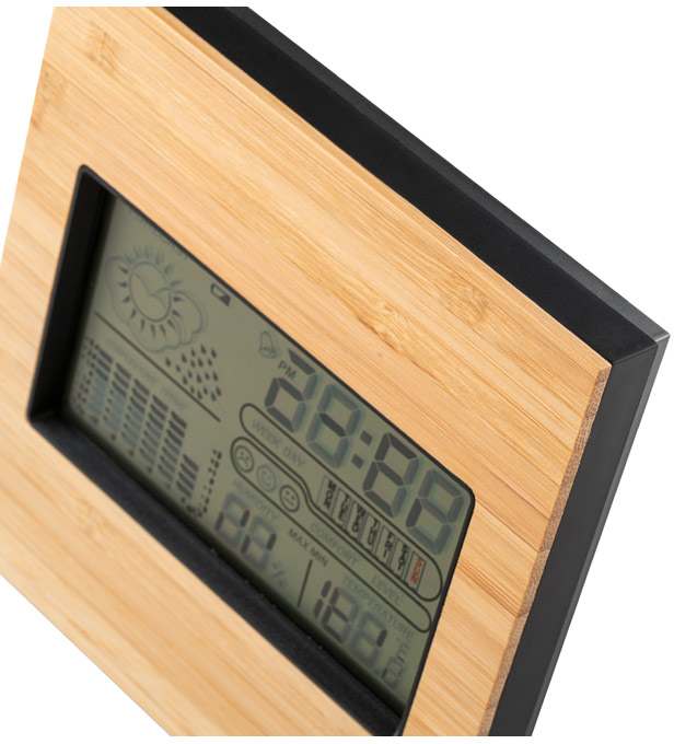 Stolní meteostanice s LCD obrazovkou z ABS a bambusu. Obsahuje hodiny, budík, kalendář, teploměr a funkce měření vlhkosti. Funguje na 2 baterie AAA (nejsou součástí balení). Dodáváno v dárkové krabičce z kraftového papíru. Protože je výrobek vyroben z přírodních materiálů, barva a velikost výrobku a výsledek tisku se mohou u jednotlivých výrobků lišit