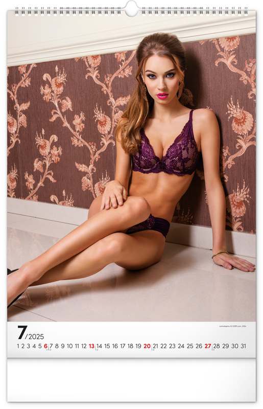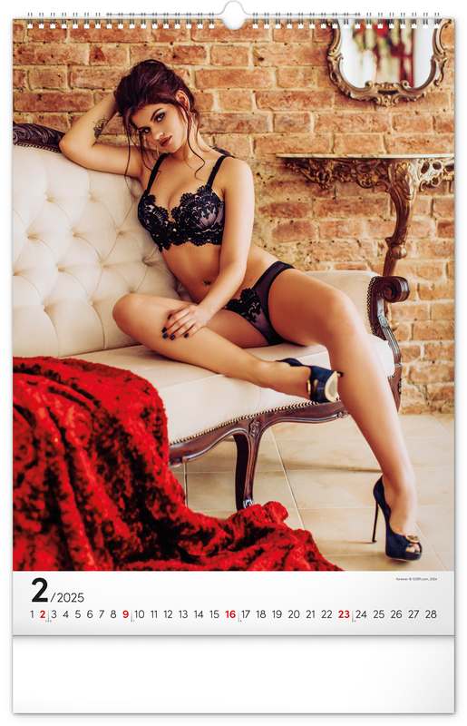 Exkluzivní akty krásných žen. Kalendář obsahuje jednoduché kalendárium se zvýrazněnými nedělemi na čistém bílém pozadí.