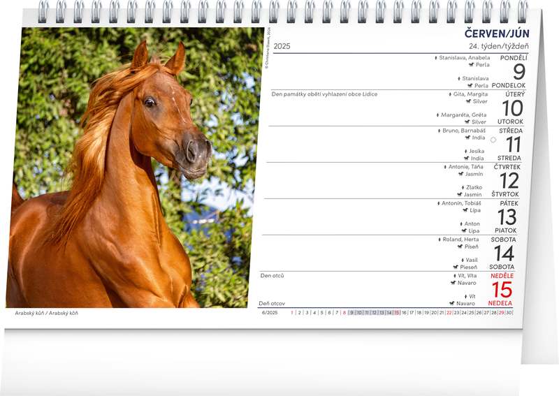 Oslavte svátek spolu se svým koňským parťákem - v tomto praktickém stolním kalendáři najdete jména koní na každý den. Kalendář obsahuje týdenní české i slovenské kalendárium i se svátky a památnými dny, jména koní a fáze měsíce. Kalendář zdobí hezké fotografie od Christiane Slawik a nechybí ani prostor na poznámky.