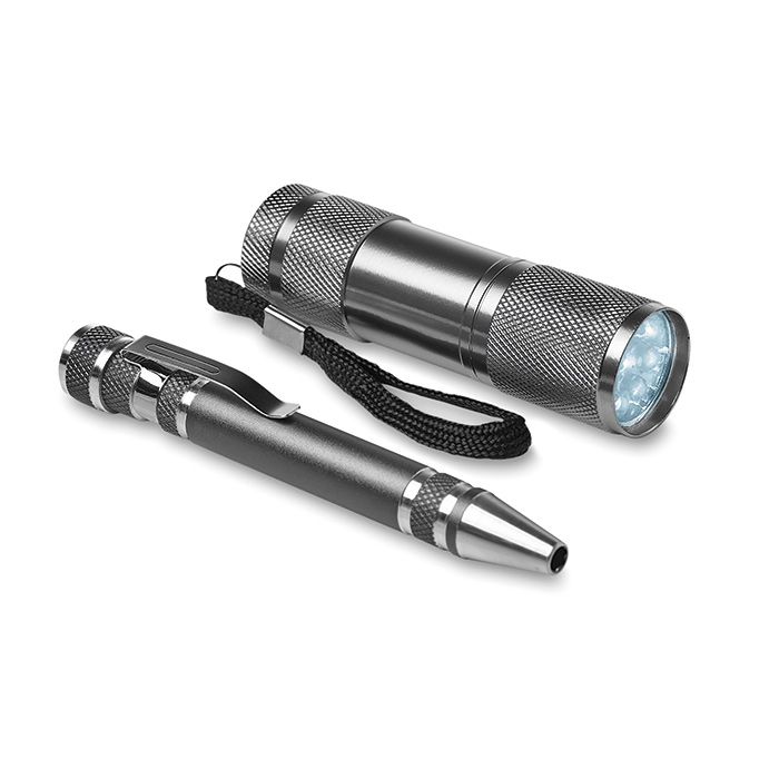 Sada nářadí s 9 LED hliníkovou baterkou a hliníkovým multifunkčním nástrojem tvaru pera. Obsahuje 3 štěrbinové a 3 křížové šroubováky. 3 AAA baterie nejsou v ceně. Baleno v krabici.
