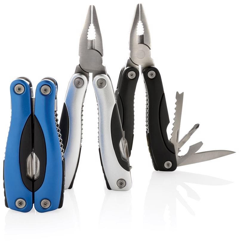 Hliníkový multifunkční nůž, rukojeť s černými detaily, 14 funkcí, uložený v černém pouzdru 600D.