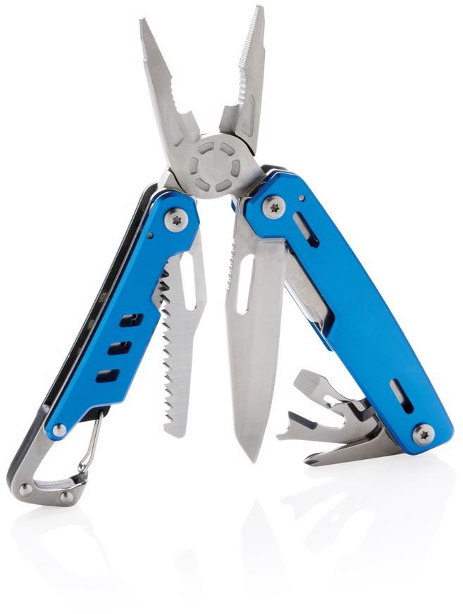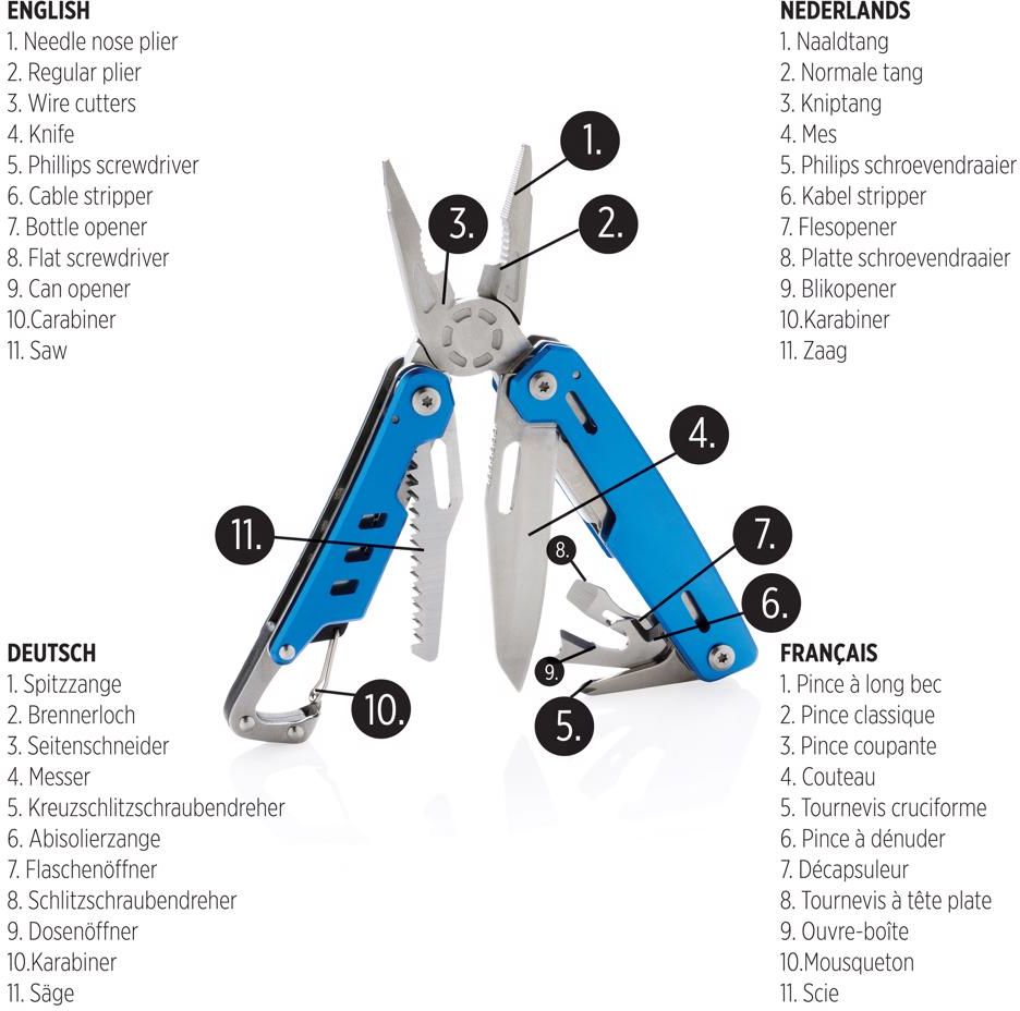 Kvalitní odolný multifunkční nůž s 11 funkcemi: kleště s jehlovou špičkou, utahovací kleště, štípací kleště, nůž, křížový šroubovák, plochý šroubovák, pilka, otvírák plechovek a lahví, odstraňovač izolace drátů, karabina. Tělo z hliníku, nástroje z nerezové oceli. Baleno v dárkové krabičce.