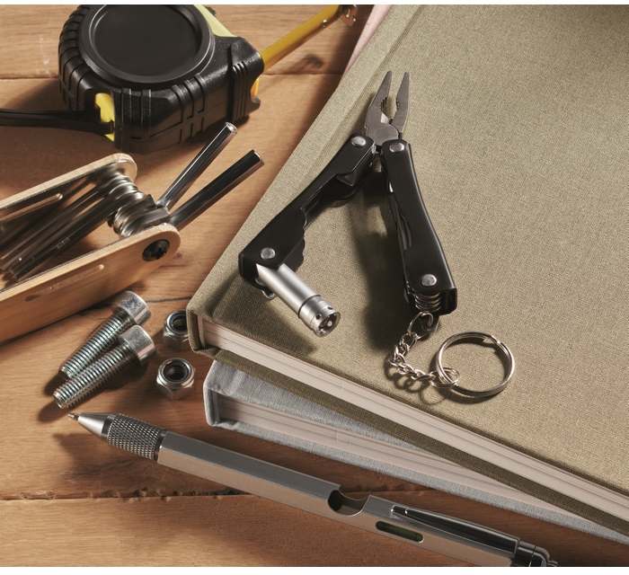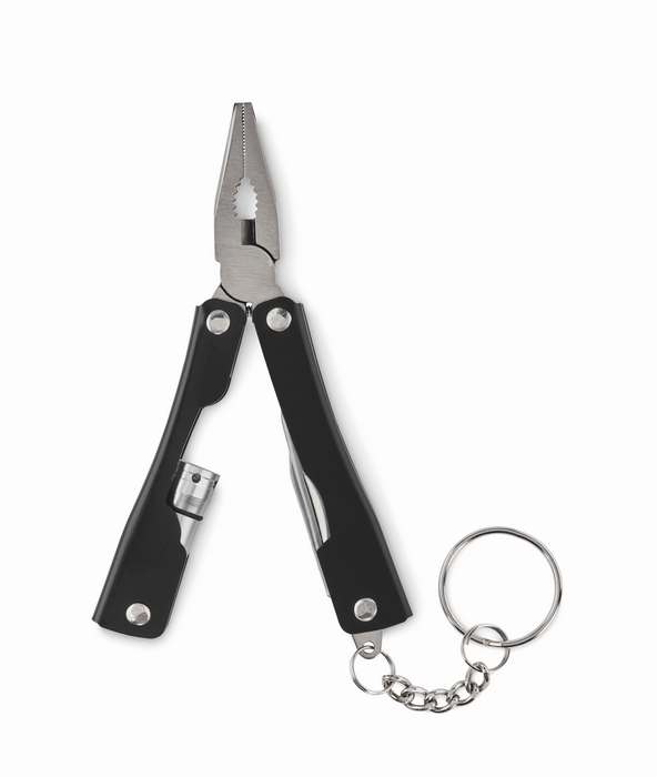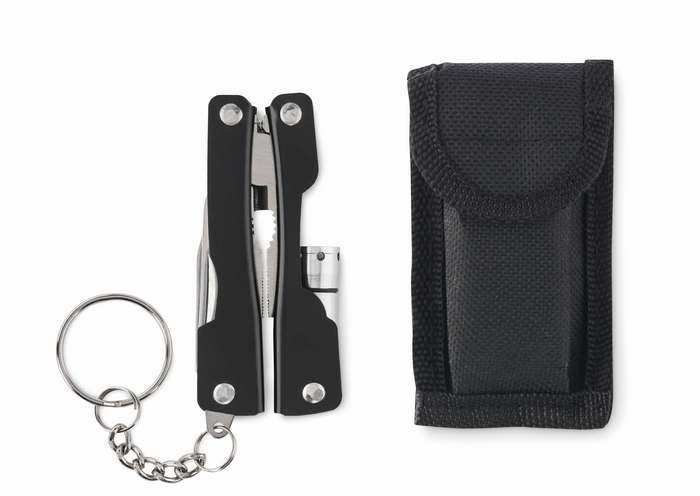 Skládací multifunkční nůž se svítilnou z nerezové oceli. 10 funkcí. Pouzdro z polyesteru 600D. Včetně 3 baterií AG3.