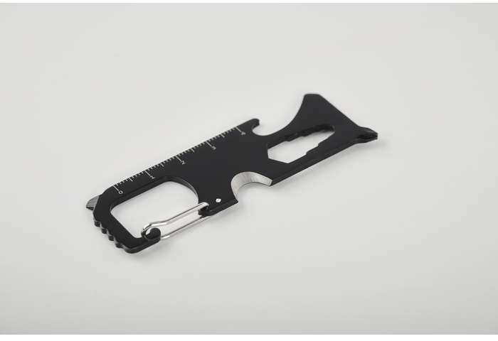 Univerzální kapesní nářadí a klíčenka z nerezové oceli. 8 funkcí: pilka, řezačka drátu, klíč, křížový šroubovák, plochý šroubovák, měřící stupnice a otvírák na láhve.